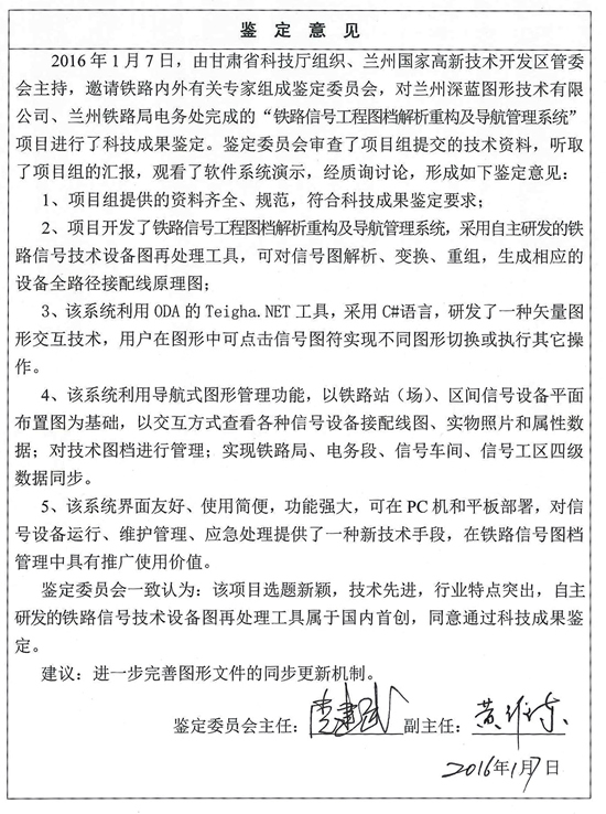 1月7日,由甘肅省科技廳組織、蘭州國家高新技術開發區管委會主持,對我公司與蘭州鐵路局電務處協作完成的“鐵路信號工程圖檔解析重構及導航管理系統”和“高速鐵路信號運維生產管理信息化平臺”兩個項目進行了科技成果鑒定。